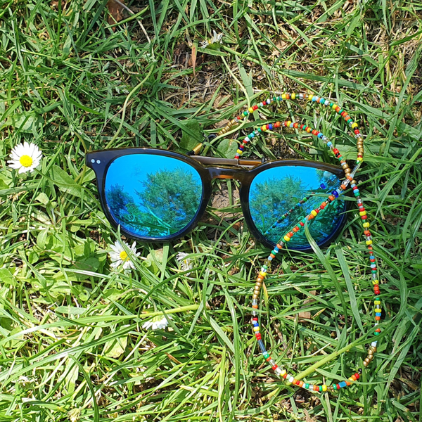 Helemaal je festival outfit afmaken of liever een klein detail met de leuke kleuren, beide kan met dit zonnebrilkoordje. Handgemaakt met seedbead kralen bij Liloux.